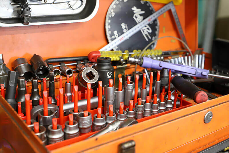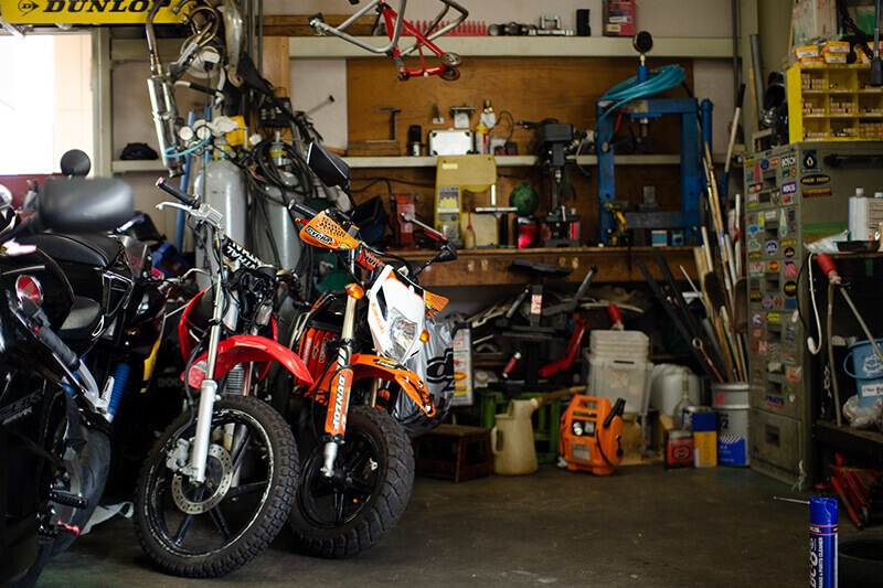 アドベンチャーは愛知県みよし市にある愛知県中部陸運局認証工場です。オフロードバイクを特に得意としていますが、スクーターのパンク修理から前後サスペンションやエンジンのオーバーホールなどの重整備も得意です。溶接修理やHONDA-FI診断機を使ったトラブル診断にも対応しています。